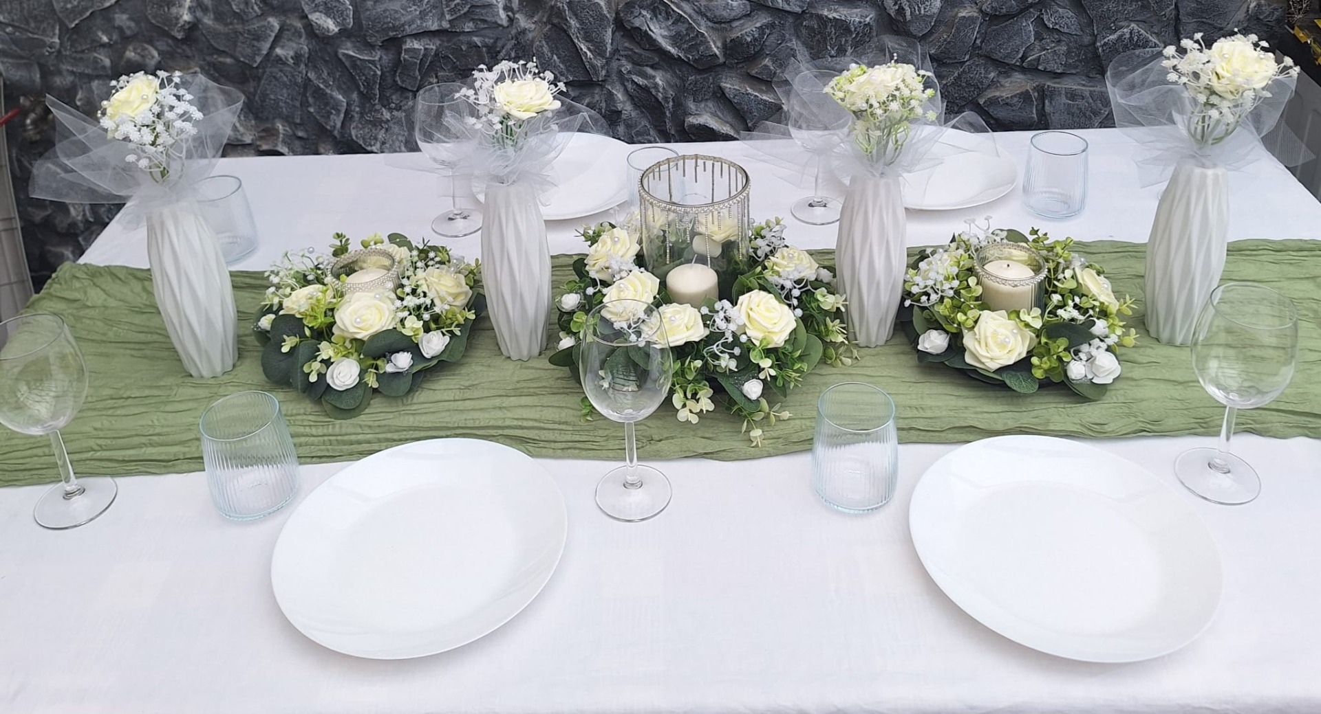 Základ setu 1x velký středový svícen 30 cm,2x menší svícen,4x vázička s květinou,1x běhoun zelené přírodní barvy.